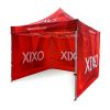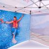 Tendas publicitárias com impressão digital por sublimação. A impressão é realizada por meio de um processo químico no qual a tinta penetra diretamente na estrutura do tecido devido ao calor. Logotipo, texto ou qualquer outro tipo de gráfico na parte interna ou externa da tenda de acordo com o desejo do cliente.