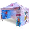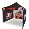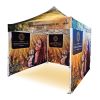 Tendas publicitárias com impressão digital por sublimação. A impressão é realizada por meio de um processo químico no qual a tinta penetra diretamente na estrutura do tecido devido ao calor. Logotipo, texto ou qualquer outro tipo de gráfico na parte interna ou externa da tenda de acordo com o desejo do cliente.