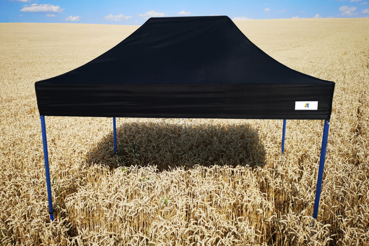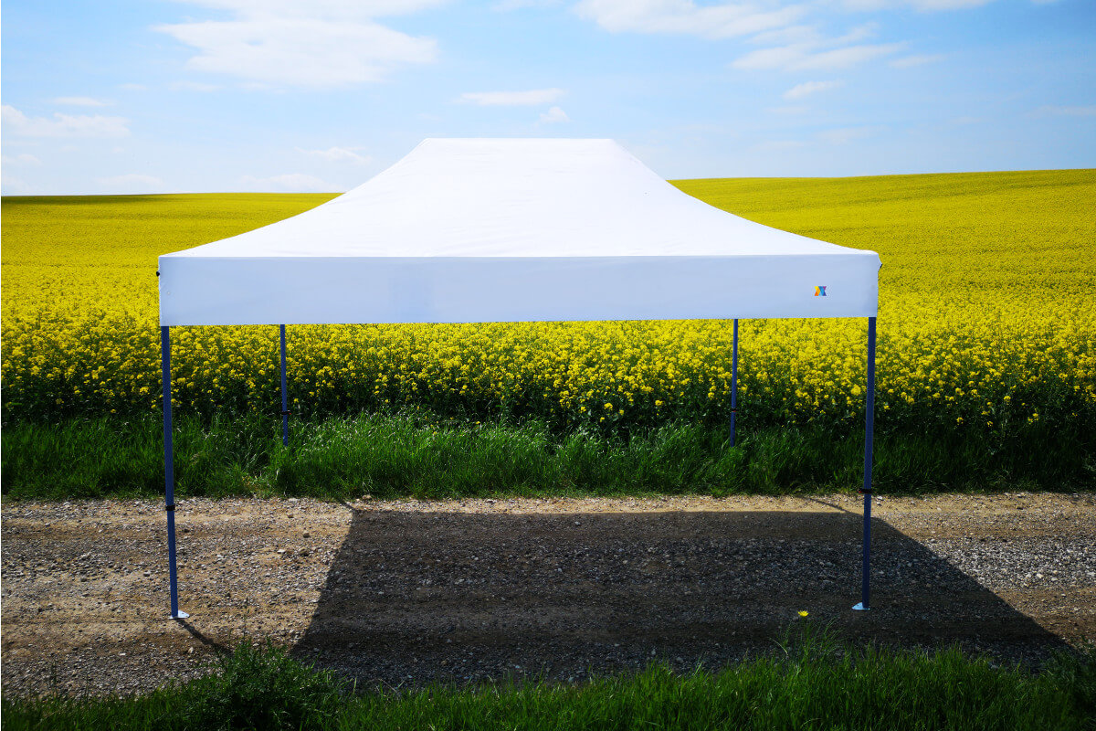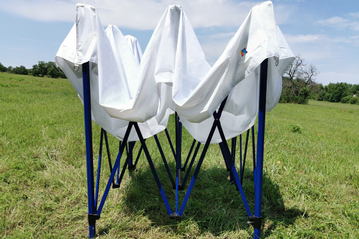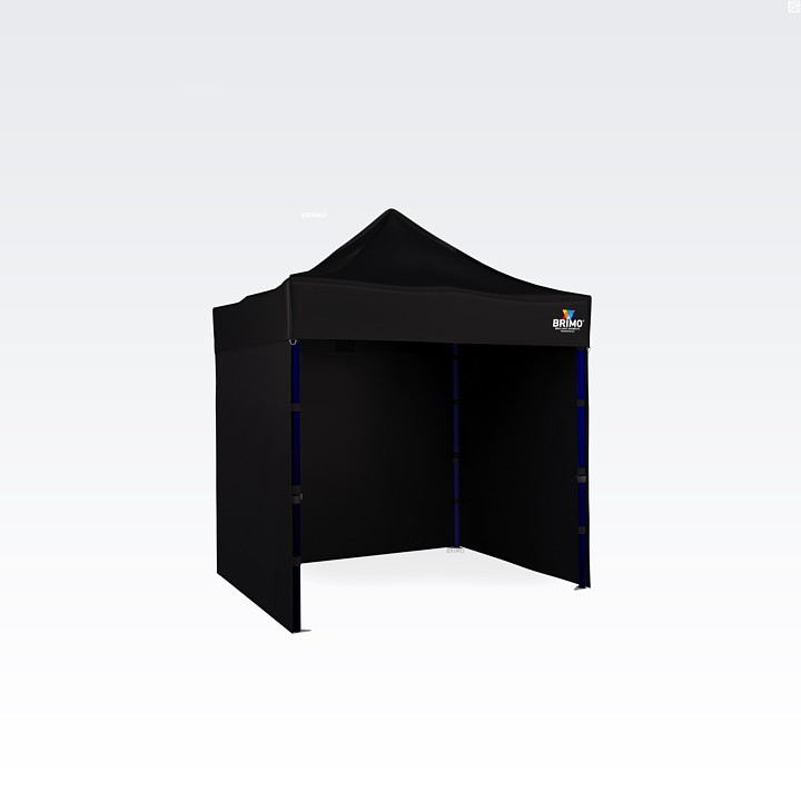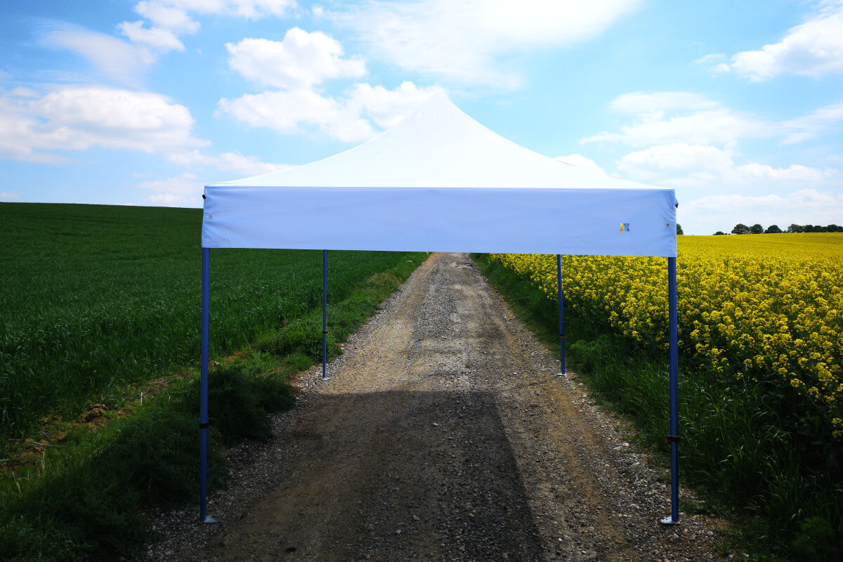 A tenda pavilhão comercial 2x2m da série Exclusive, feita de aço, ocupa pouco espaço e é ideal para cobrir uma pequena quantidade de pessoas (1-4). Ela ocupa menos espaço visualmente, o que a torna adequada para cobrir equipamentos de áudio em concertos ao ar livre. Devido ao seu tamanho compacto, não há espaço para dançar nela.