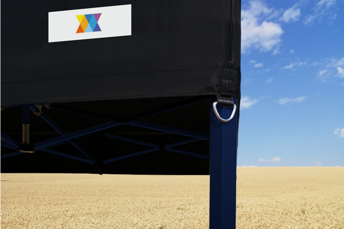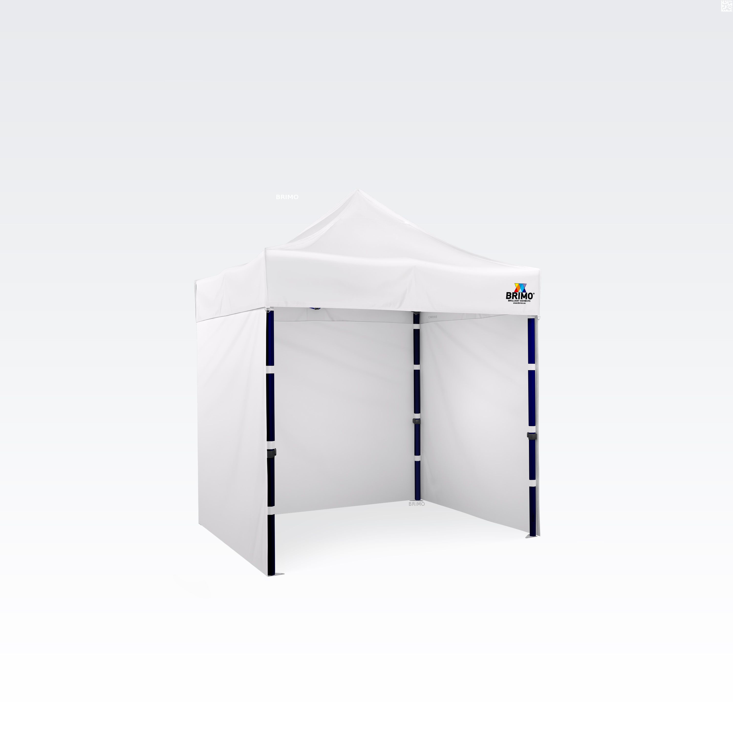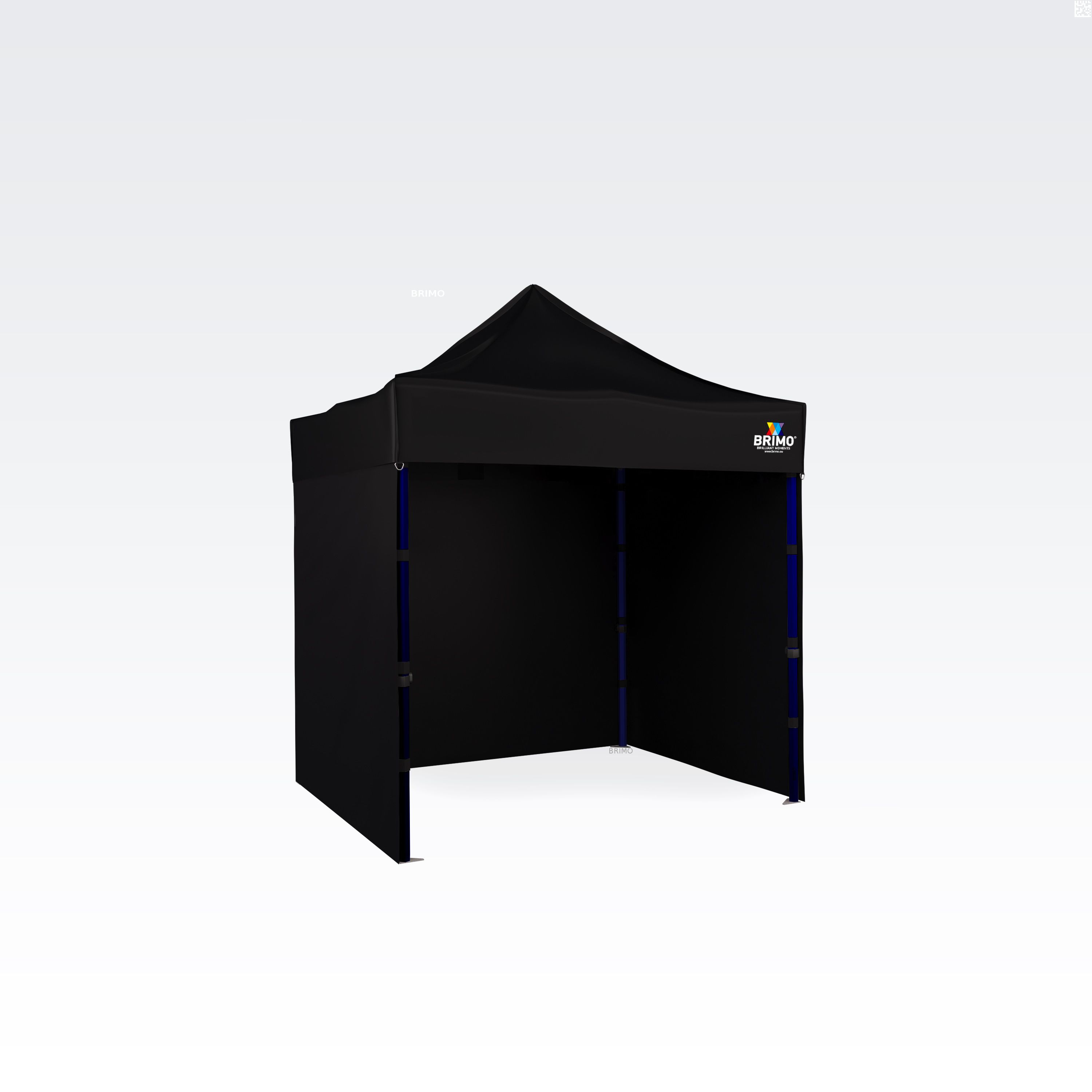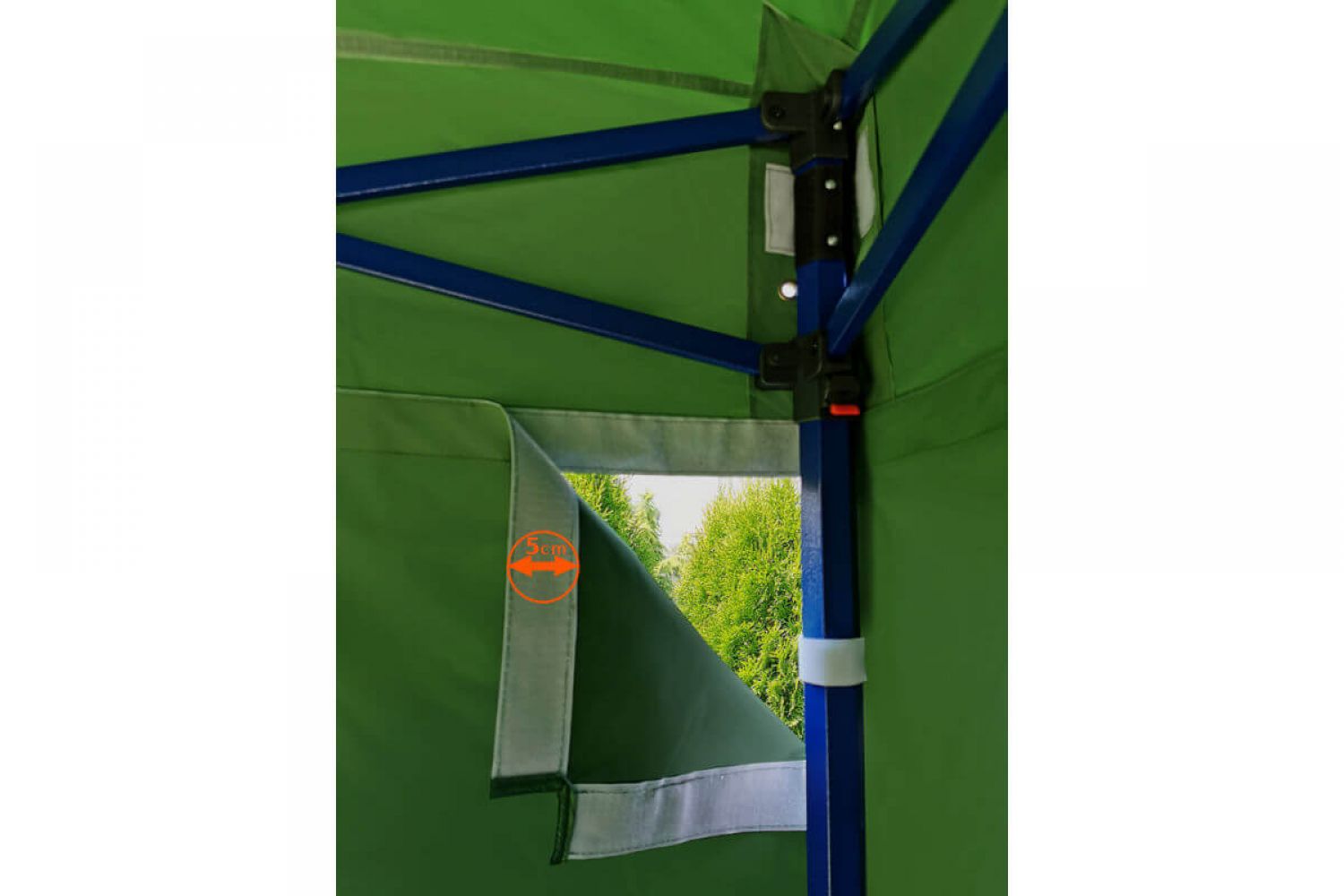 Ao adicionar 3 paredes, que sempre fazem parte do conjunto, você tem um lado aberto para apresentações, mas, se desejar fechar a tenda contra o vento e a chuva, pode fazê-lo com uma quarta parede com porta e janela. Você pode encontrar a parede na seção de acessórios. A fixação das paredes é facilitada por velcros largos de 5cm.