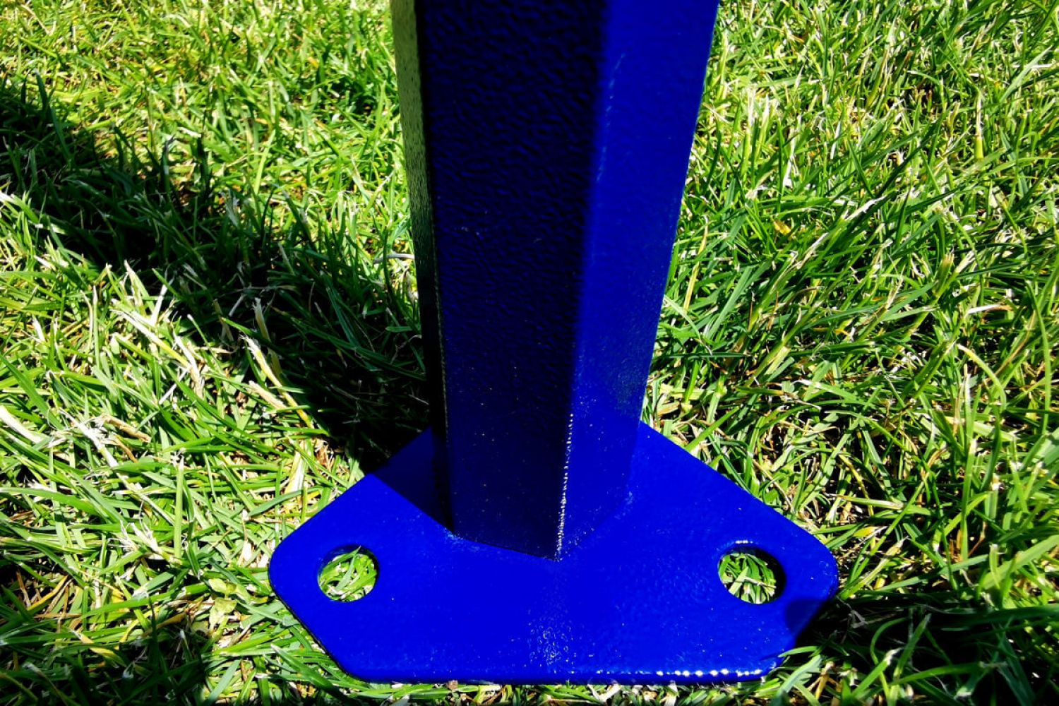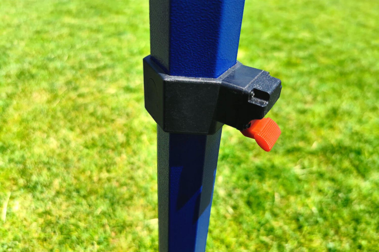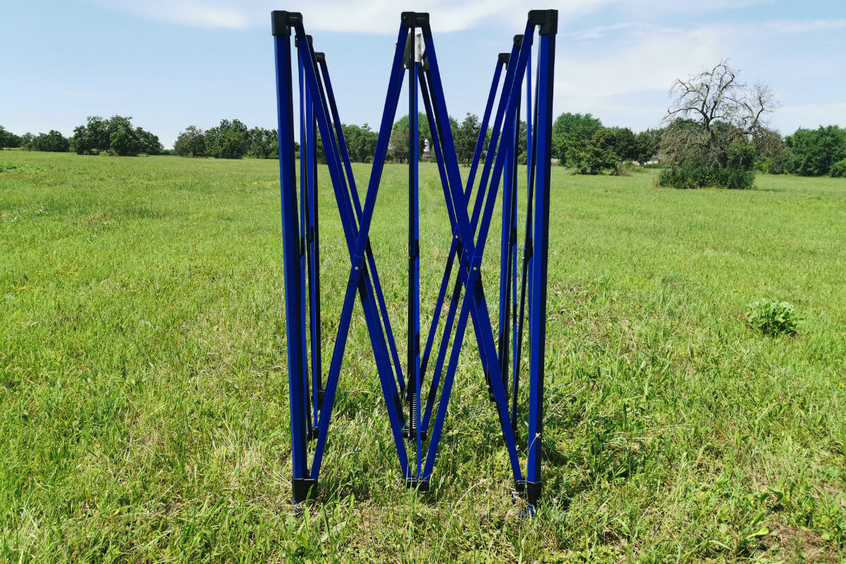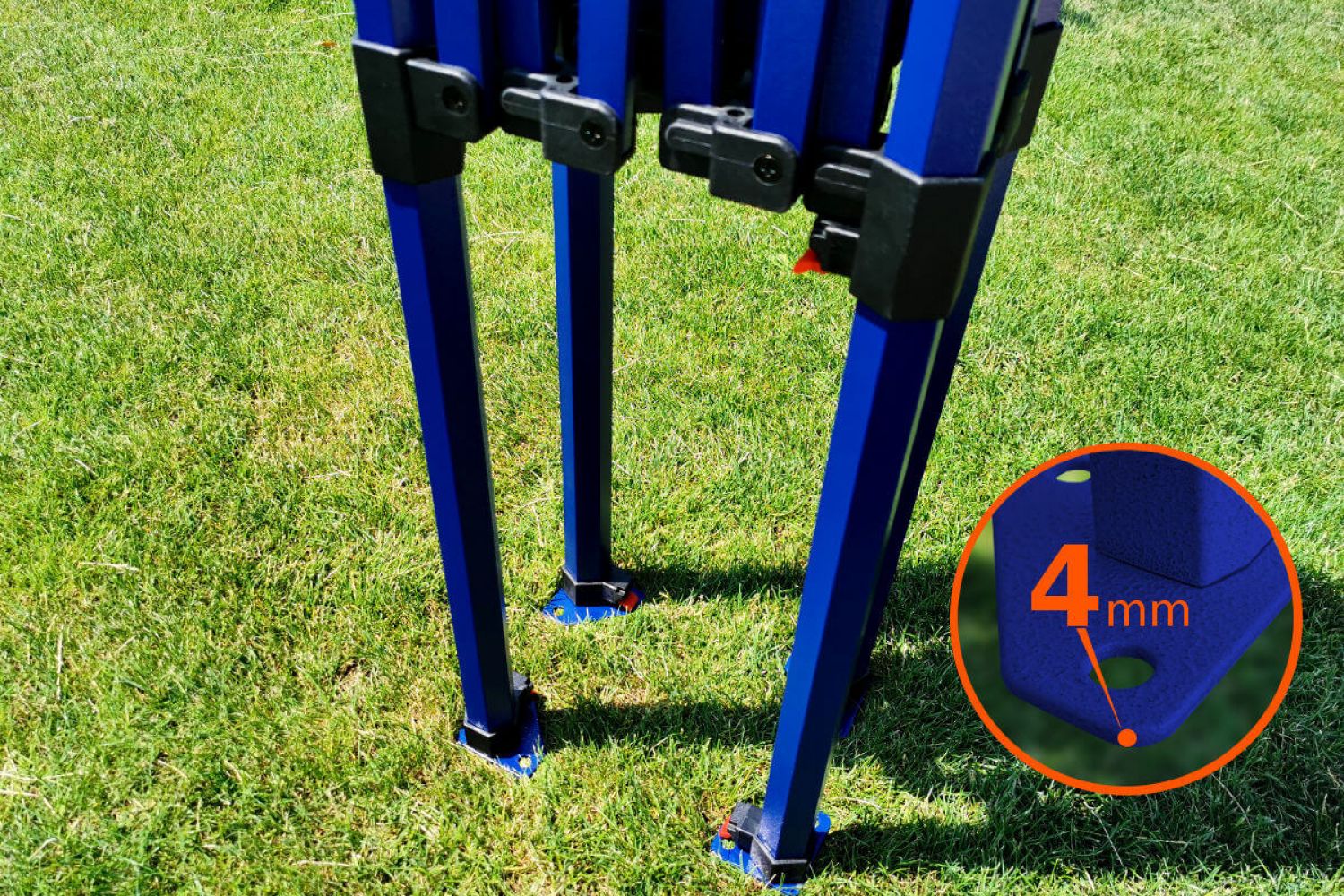 As tendas pavilhão comercial são feitas com perfis de aço de alta qualidade e mais espessos. Por isso, este modelo é muito resistente. As pernas possuem um perfil hexagonal com uma base muito espessa que possui orifícios para fixação das estacas, que sempre estão incluídas no conjunto. O revestimento azul tem um efeito atemporal e é altamente resistente a arranhões.